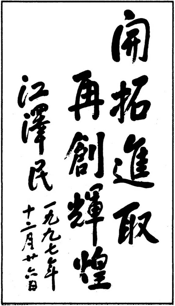 1997年12月26日,江澤民同志為中國(guó)船舶工業(yè)總公司題詞:“開(kāi)拓進(jìn)取,再創(chuàng)輝煌”。