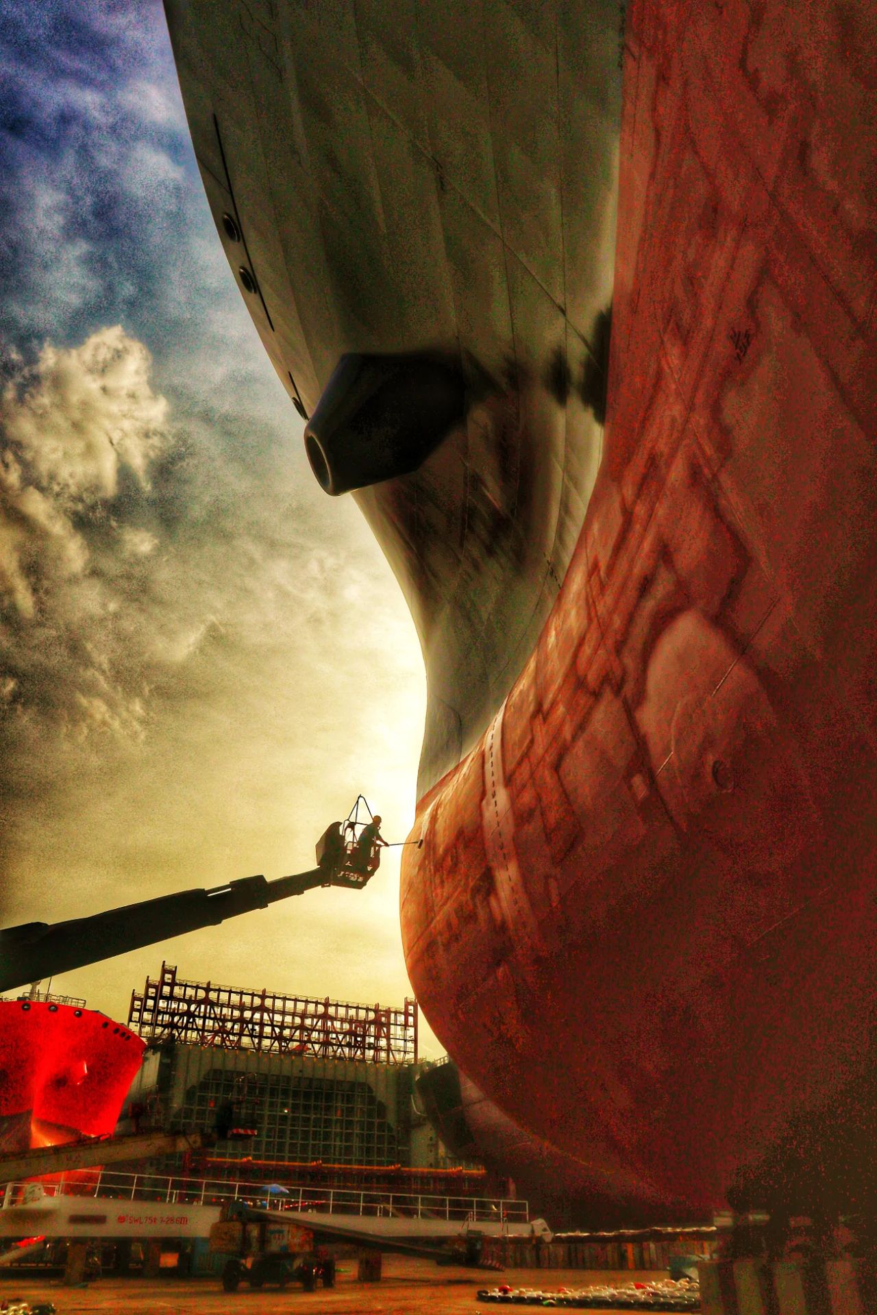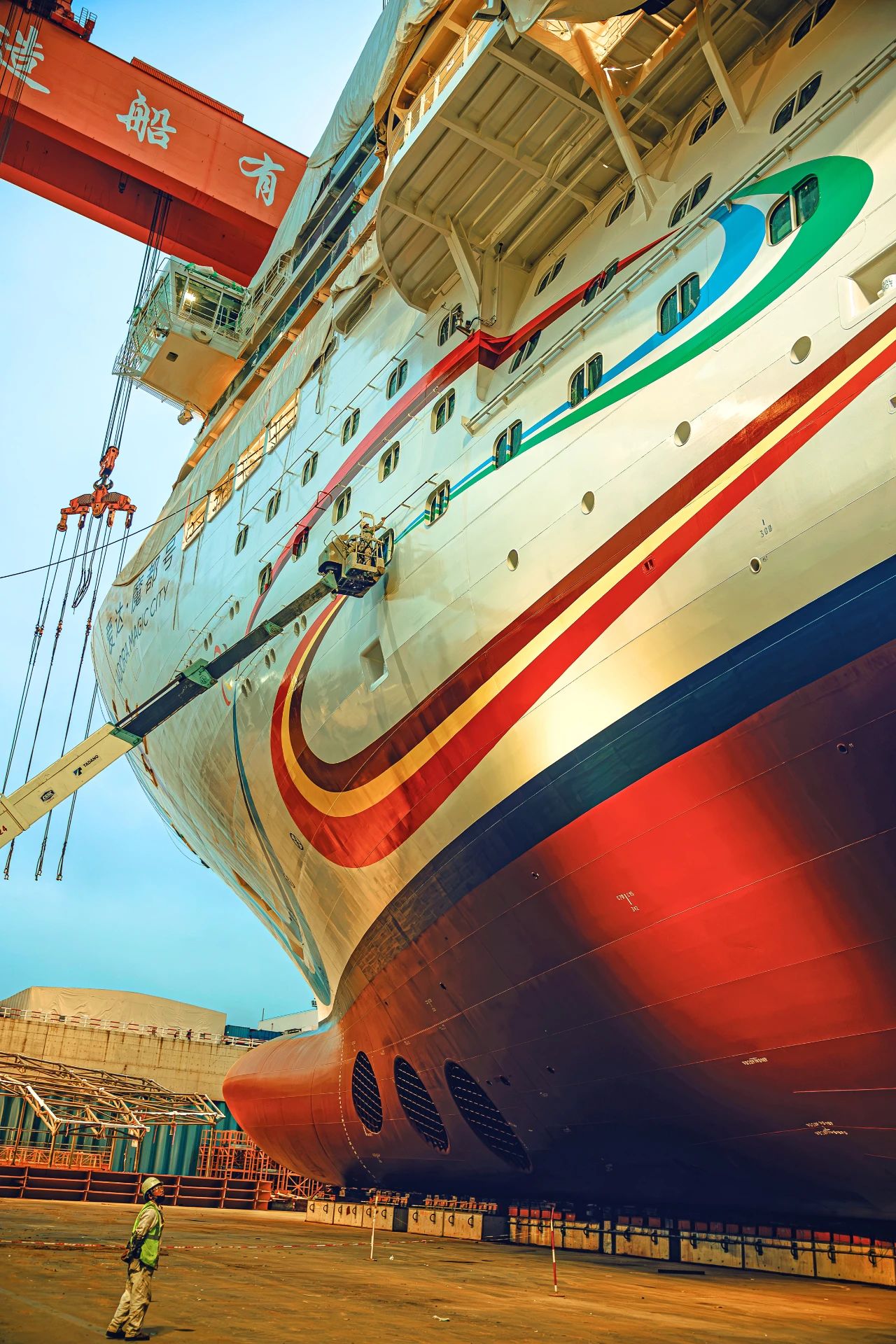 照片攝于國產(chǎn)首艘大型郵輪首次出塢前夕,拍攝時(shí)期為傍晚,船塢開啟燈光照明,工人在對(duì)船身做最后的涂裝修飾工作。這樣的角度觀看國產(chǎn)首艘大型郵輪令人無比震撼。