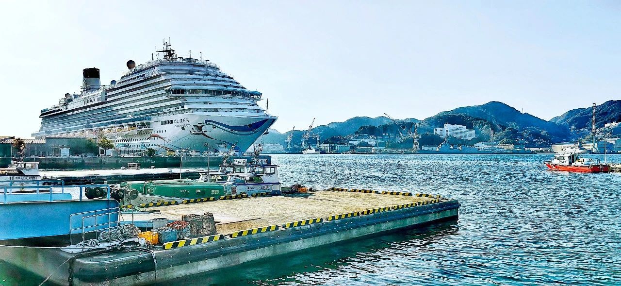 中國首艘國產(chǎn)大型郵輪“愛達(dá)·魔都號(hào)”與曾經(jīng)建造過郵輪的日本三菱重工船廠隔江相望。