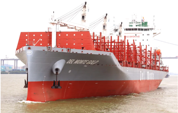 近日,中國船舶集團旗下黃埔文沖為美國Del Monte公司建造的600FEU全冷藏集裝箱船首制船“DEL MONTE GOLD”號交付。該型船總長192米,型寬30米,設(shè)計吃水9.3米,為國際遠洋冷藏集裝箱船,全部貨柜箱均為冷藏集裝箱,是一款冷箱量大、裝載靈活、便于維護的綠色環(huán)保型船舶。