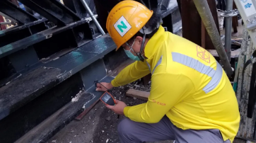 泛廣公司員工在香港大埔運(yùn)動(dòng)場工地檢測油漆厚度