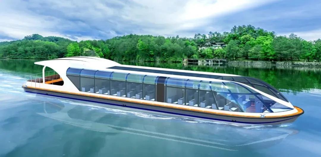 △ 新疆喀納斯新能源游船總長19.7米,船寬4.5米,型深1.6米,最大航速18km/h,乘客60人。