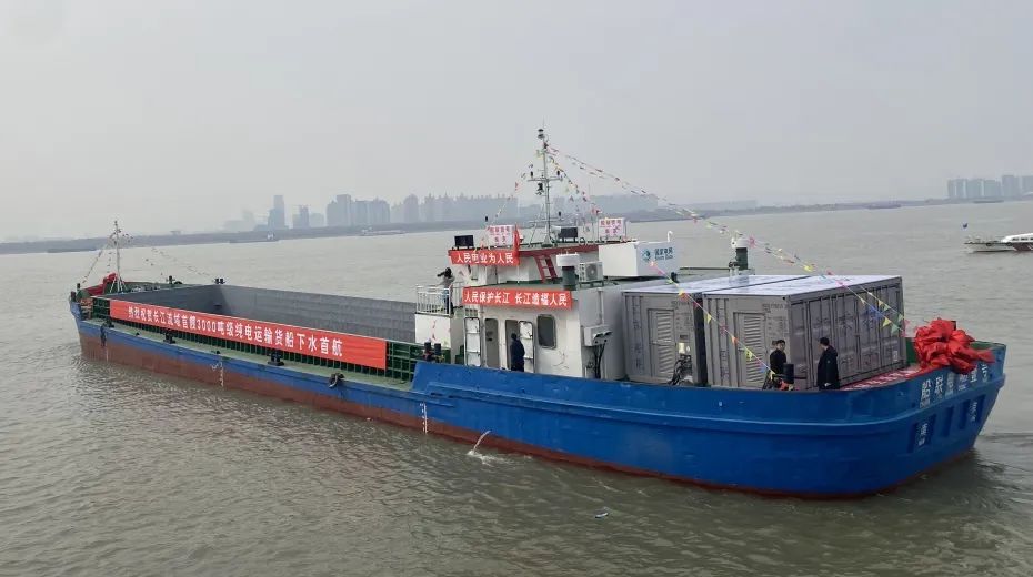 “船聯(lián)1號”由國網(wǎng)江蘇省電力有限公司聯(lián)合相關(guān)部門和企業(yè)共同打造,是長江流域最大載重噸位的電動貨船,將電能作為整艘船的唯一能源,實現(xiàn)零排放、低噪音、無污染。