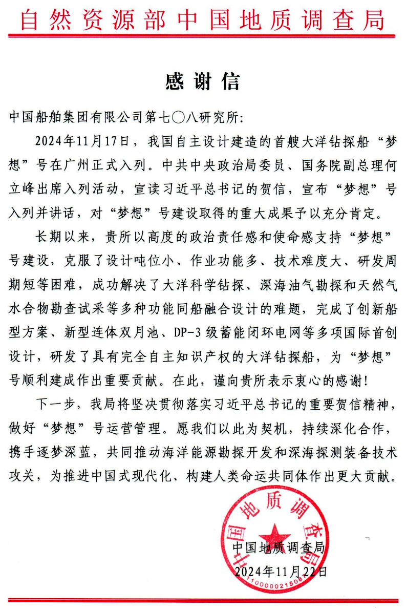 中國(guó)地質(zhì)調(diào)查局在信中對(duì)中國(guó)船舶集團(tuán)七〇八所在“夢(mèng)想”號(hào)立項(xiàng)論證、研發(fā)設(shè)計(jì)、建造調(diào)試等階段所做的突出工作和卓越貢獻(xiàn)表示感謝。