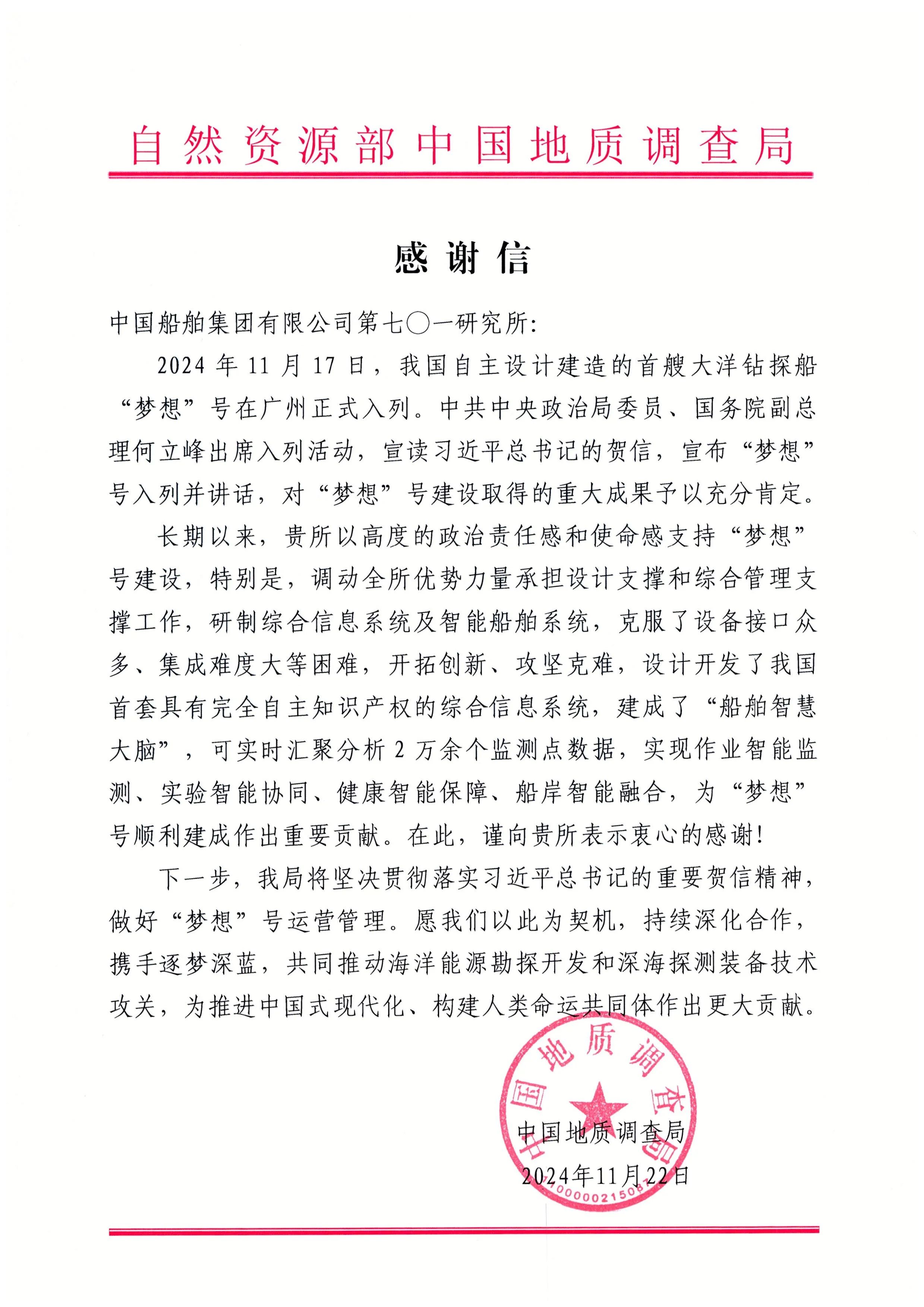 中國(guó)地質(zhì)調(diào)查局在信中對(duì)中國(guó)船舶集團(tuán)七〇一所在“夢(mèng)想”號(hào)設(shè)計(jì)支撐和綜合管理支撐、綜合信息系統(tǒng)及智能船舶系統(tǒng)研制等方面所做的重要貢獻(xiàn)表示感謝。