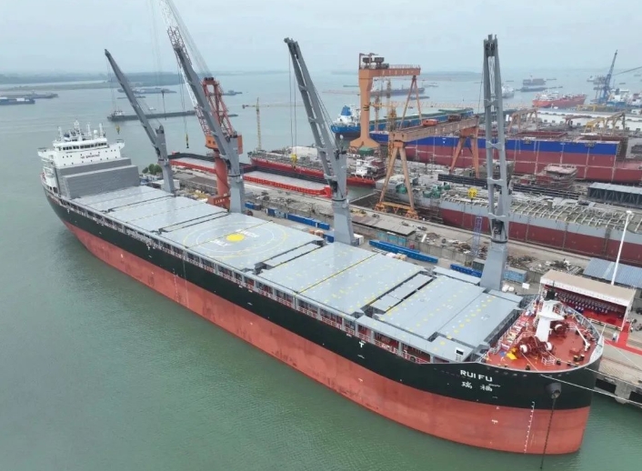 “瑞?!碧柺峭痛牡?0艘,具有裝載重大件設備貨和集裝箱式貨物的能力,首航將裝載風電設備等貨物,并投入南非航線。