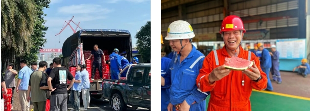 廣船國際始終將員工身心健康與安全生產(chǎn)放在首位,用科學調(diào)度、貼心保障的“組合拳”,撐起“清涼保護傘”。該公司向全體工會會員發(fā)放慰問清涼飲料,做好防暑降溫工作,保障員工健康;所屬文沖修造常態(tài)化開展“送清涼”活動,各部門自發(fā)熬煮糖水、派發(fā)西瓜,讓“清涼”直抵崗位、暖到心間。