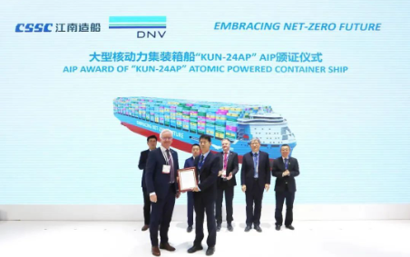 全球首型、世界最大24000箱核動力集裝箱船船型發(fā)布,挪威船級社(DNV)頒發(fā)了該船型的原則性認可證書。