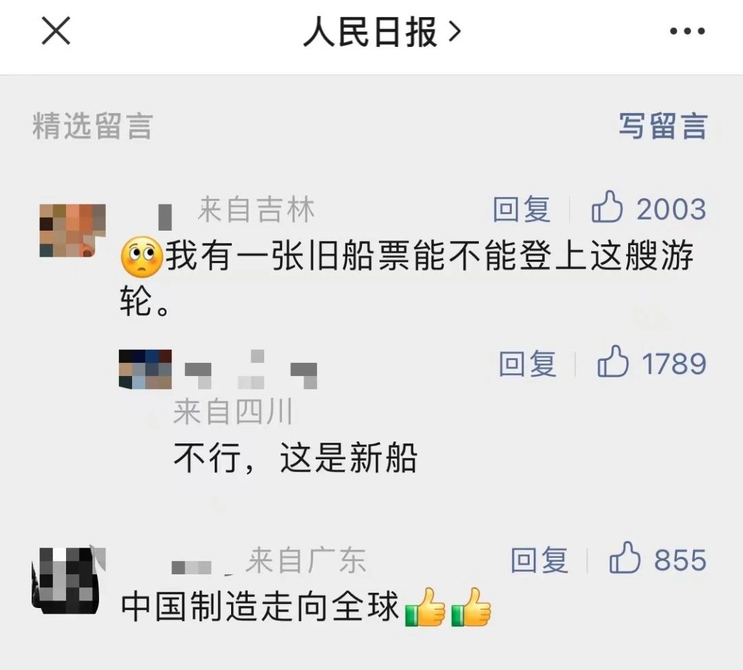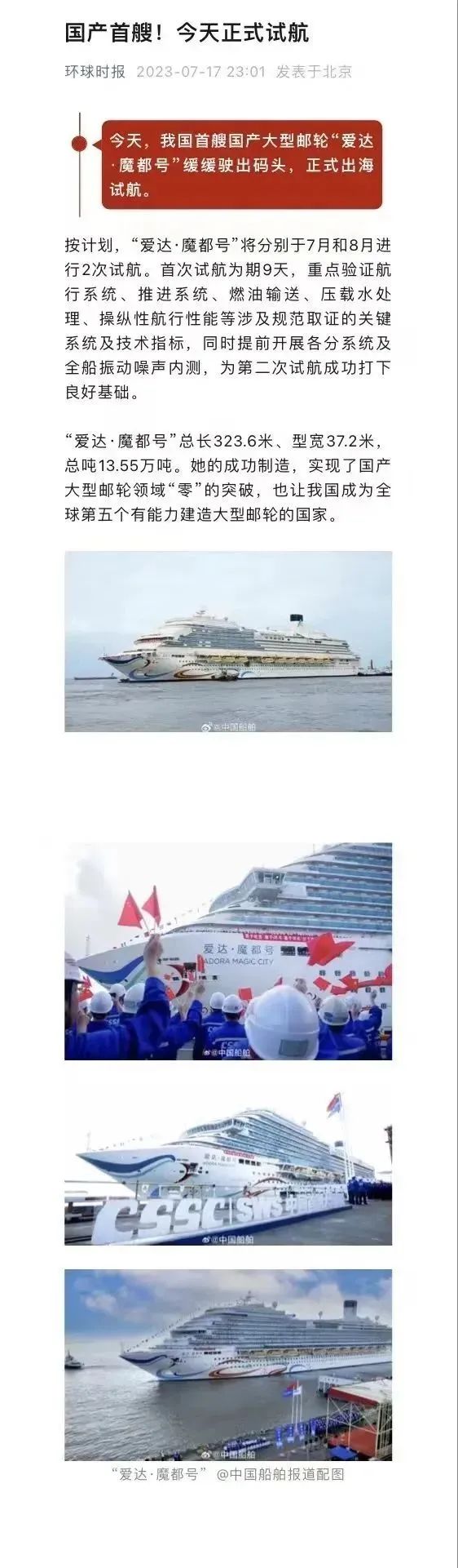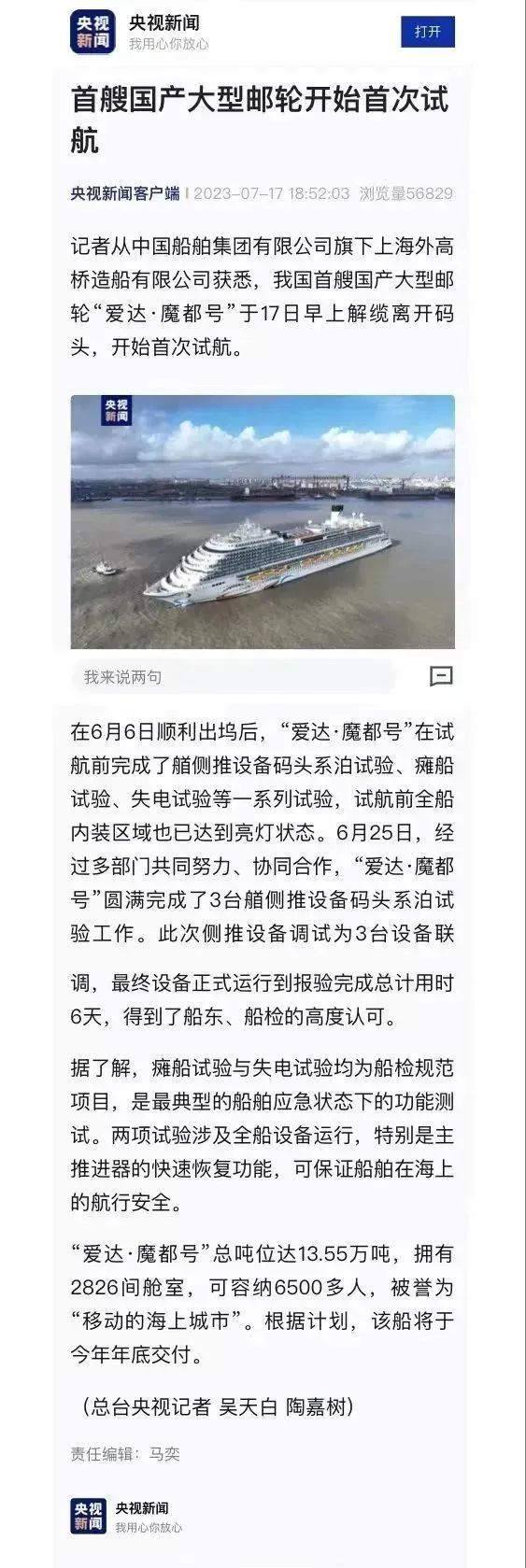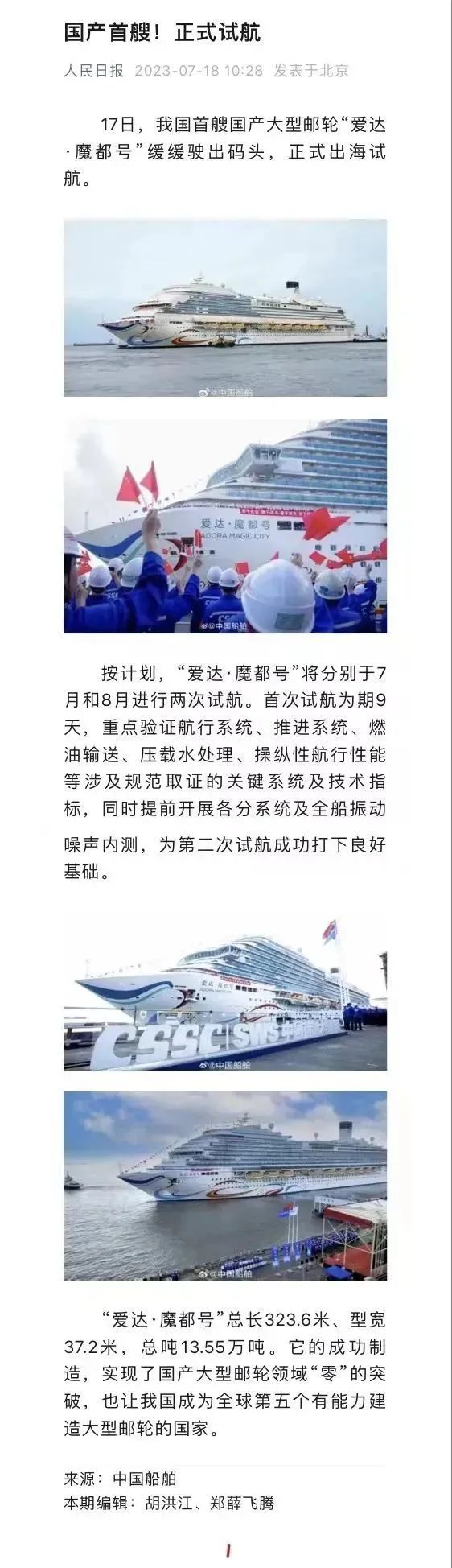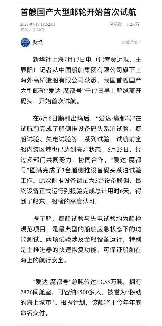 國產(chǎn)首制大型郵輪試航 各大媒體齊齊關(guān)注 ↓↓↓ 人民日報: 新華社: 央視新聞: 環(huán)球時報: 網(wǎng)友齊刷刷舉起小手手: 要上船!要上船! 讓我們一起期待 “愛達(dá)·魔都號” 試航凱旋!