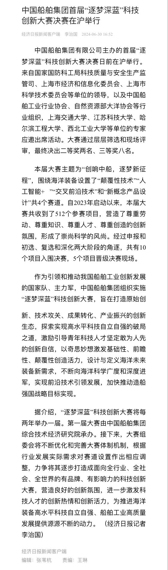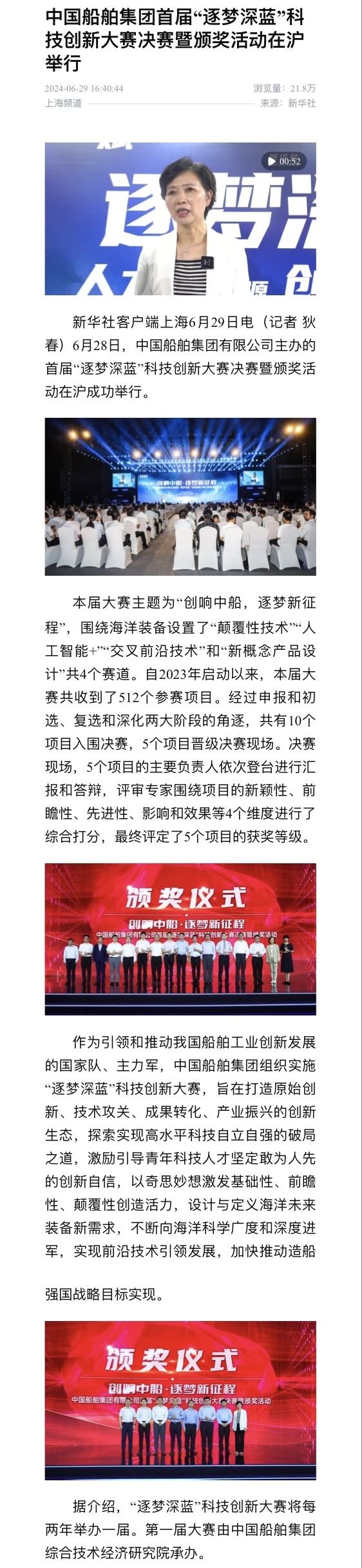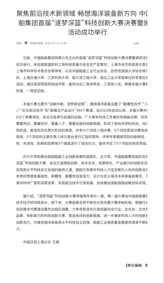 中國船舶集團(tuán)有限公司主辦的首屆“逐夢深藍(lán)”科技創(chuàng)新大賽決賽暨頒獎(jiǎng)活動(dòng)引來各大媒體的關(guān)注,獲得高度評(píng)價(jià)。——>活動(dòng)回顧