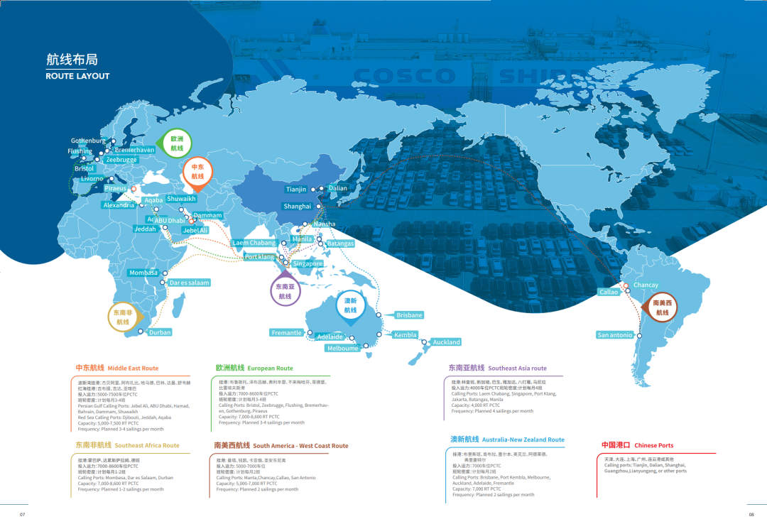 根據(jù)客戶需求,中遠(yuǎn)海運協(xié)同船隊與港口優(yōu)化航線設(shè)置和運力配置,靈活調(diào)整全球航線布局,開通中東波斯灣、東南亞、歐洲、墨西哥、中南美洲、非洲等班輪航線,為客戶定制商品車運輸整體解決方案,提供多船型、全程端到端物流服務(wù)。
